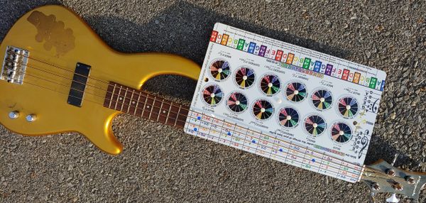 Slip the CHORDTECHER under he 4 strings of your bass guitar, dial up the chord and play the notes arpeggios